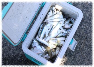 乙島E地区港湾でママカリサビキ釣りを乙島東小地域ケア会議の委員さんと実施。41匹の釣果!